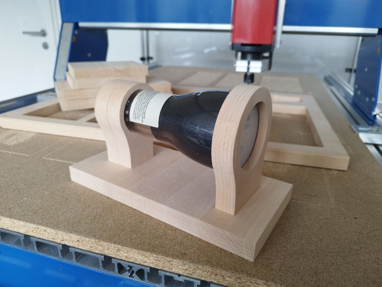So entschied ich mich, nachdem das Gehäuse im Prinzip schon fertig war, die Potis von außen zugänglich zu machen. Betroffen sind X und Y Size sowie X und Y Shift. Aufgrund der vergleichsweise geringen Durchfahrtshöhe der Fräse war die Aufspannung des fertigen Gehäuses recht abenteuerlich.
