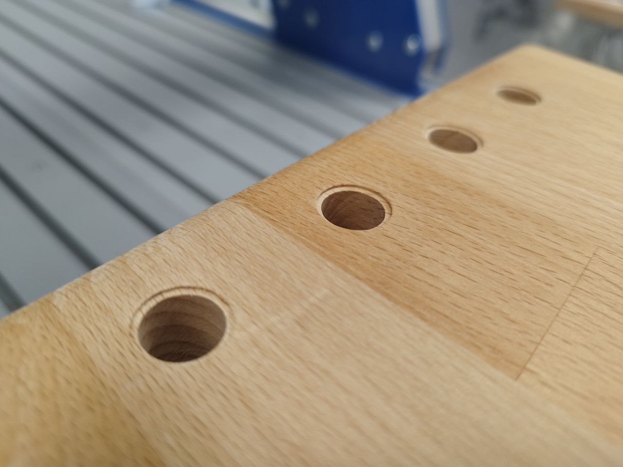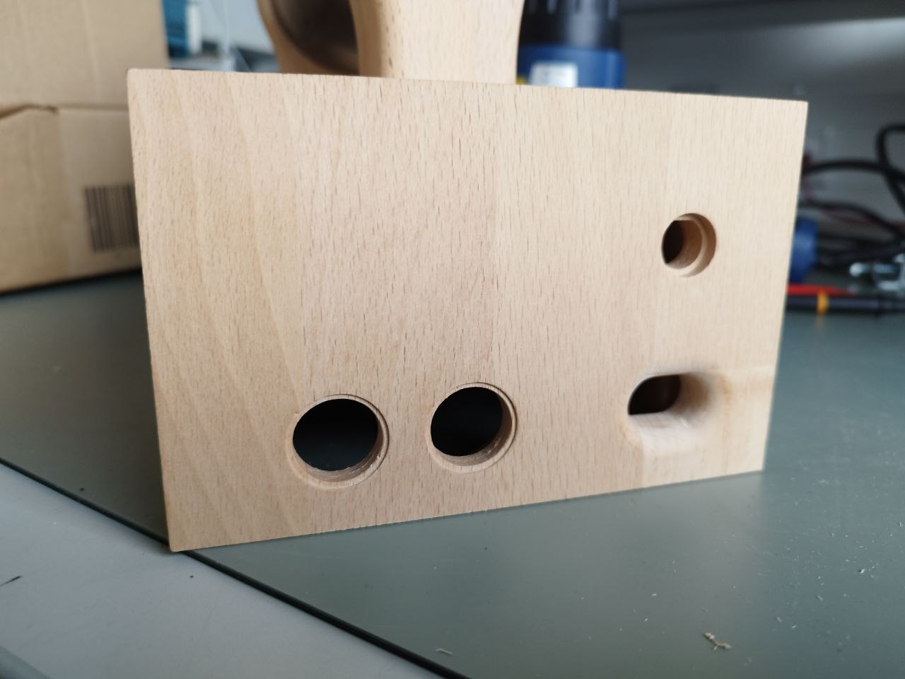 So eine Holzplatte ist natürlich viel zu dick für die Verschraubung eines Potis. Der nachträgliche Einbau machte es auch unmöglich Vertiefungen auf der Innenseite einzufräsen. So hat mir, Dieter Freind, passende Adapterhülsen aus Messing dafür gedreht - vielen Dank dafür.